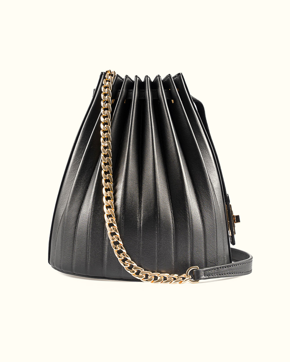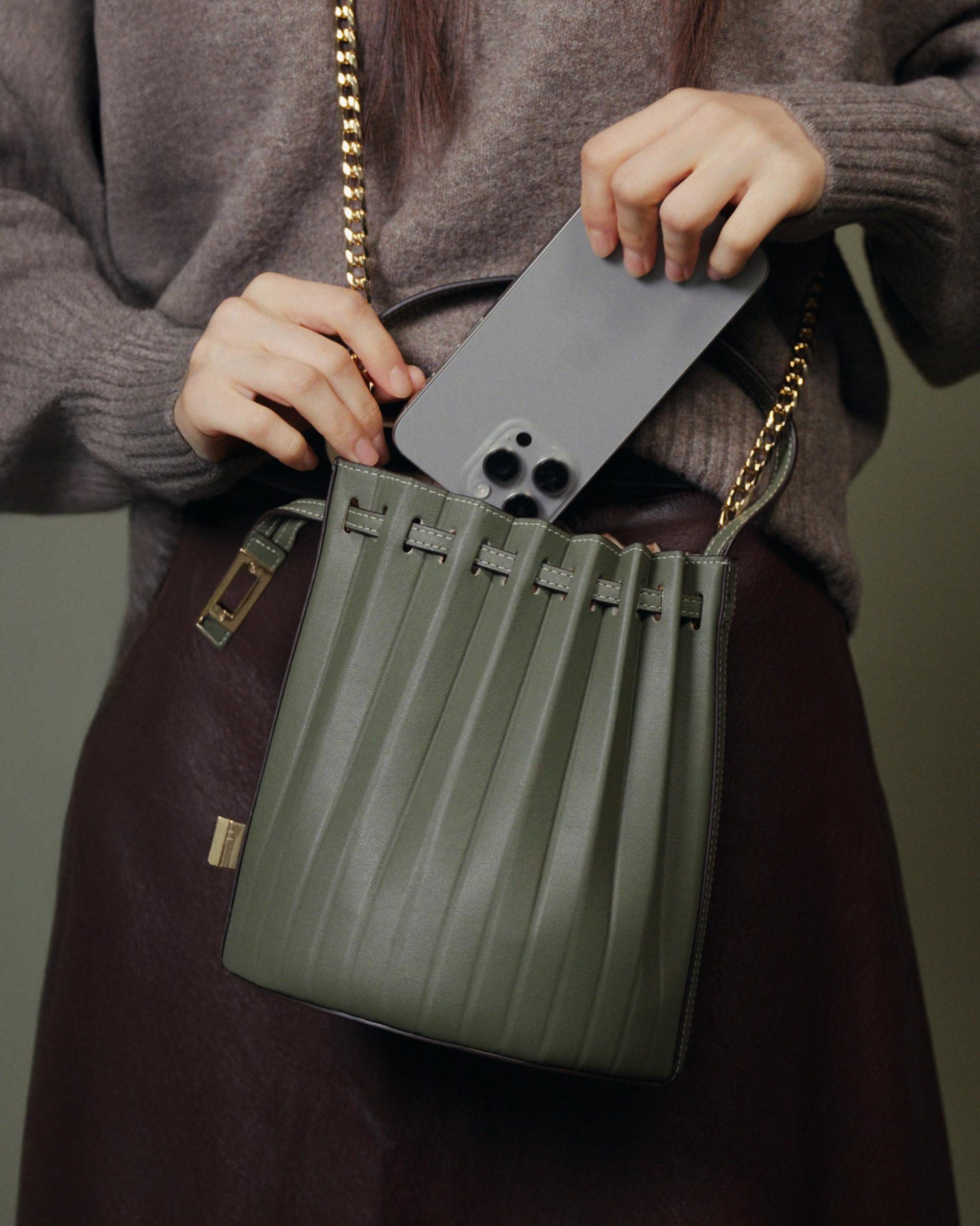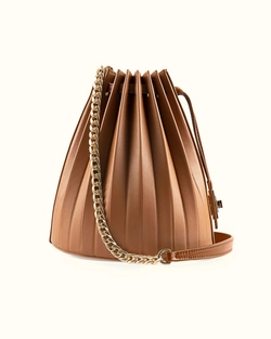부드러운 탑그레인 천연 소가죽과 정교한 플리츠 디테일의 만남.