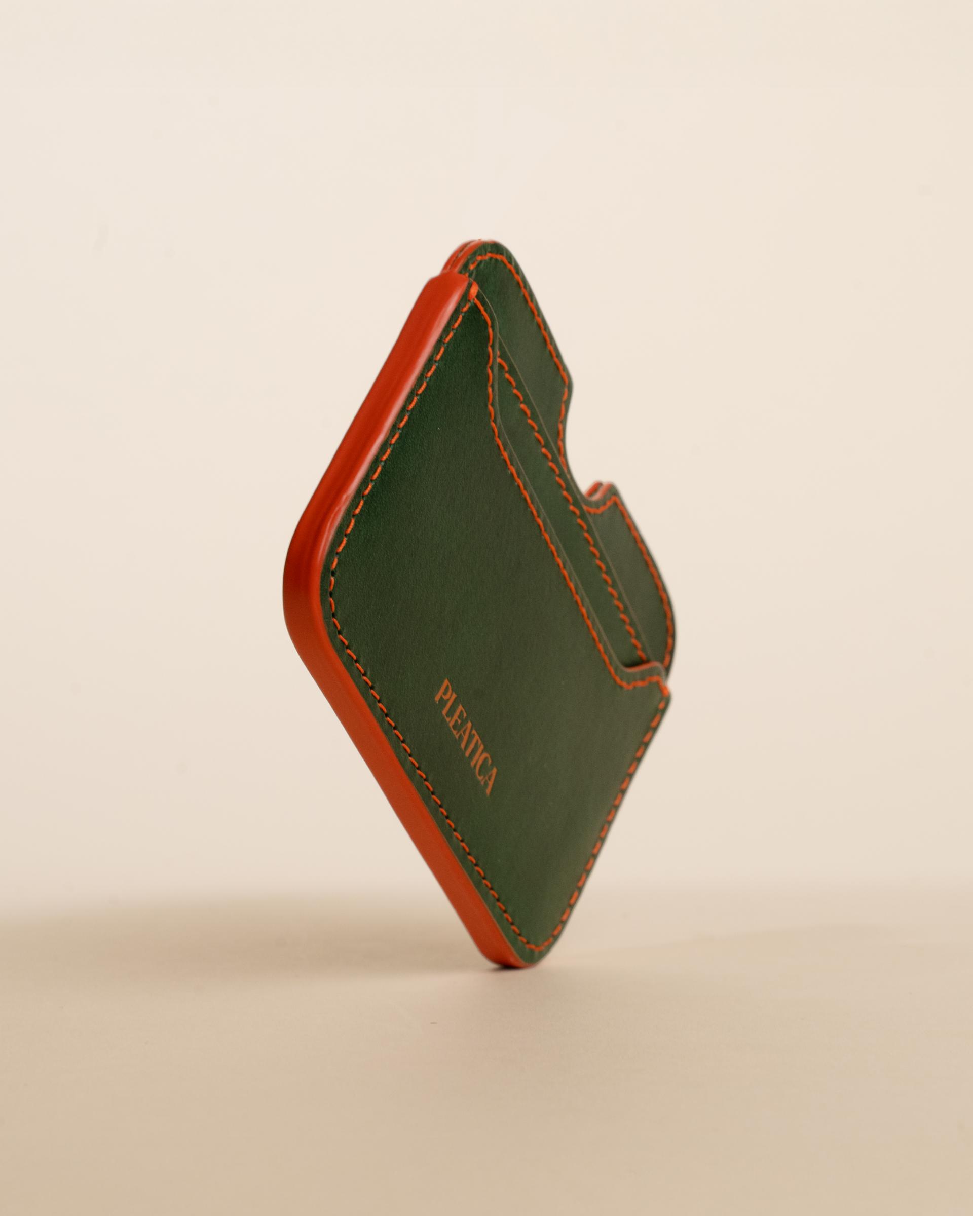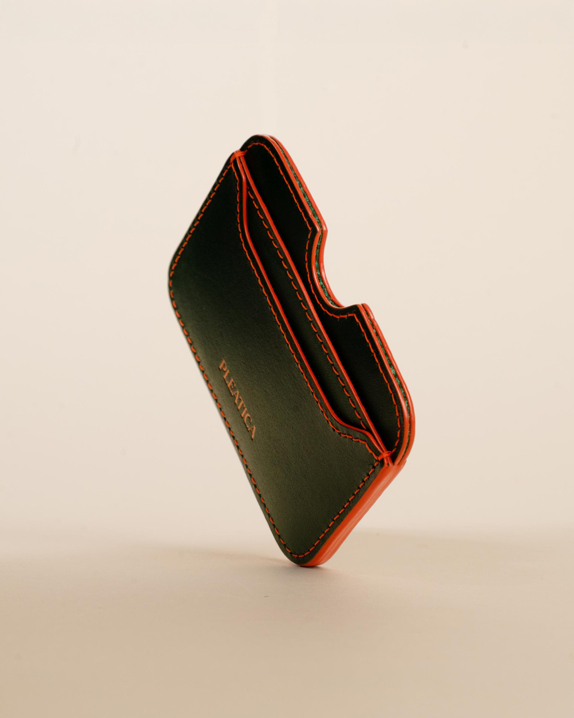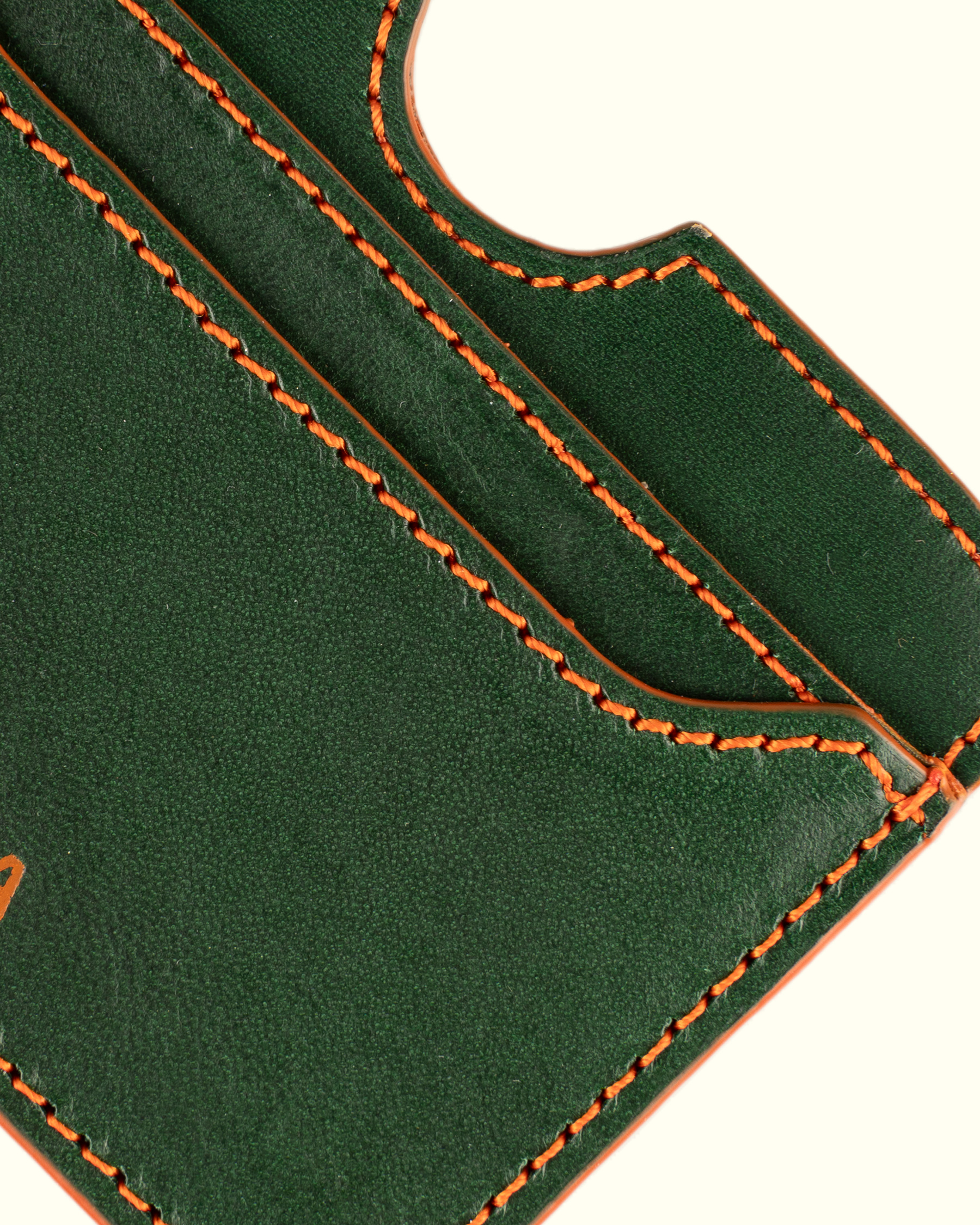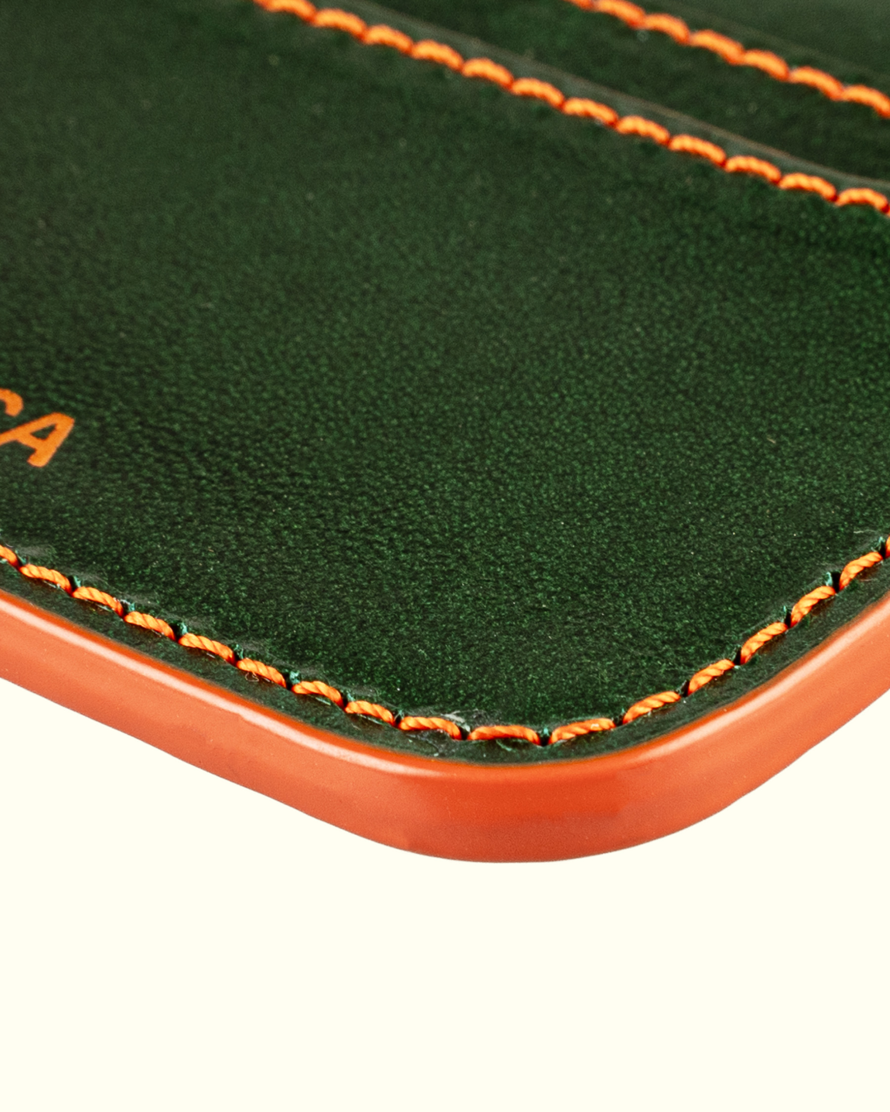 딥 그린 가죽에 오렌지 스티치가 더해져서, 마치 숲 속에서 나무 사이로 비치는 반짝이는 햇살을 떠올리게 해요.