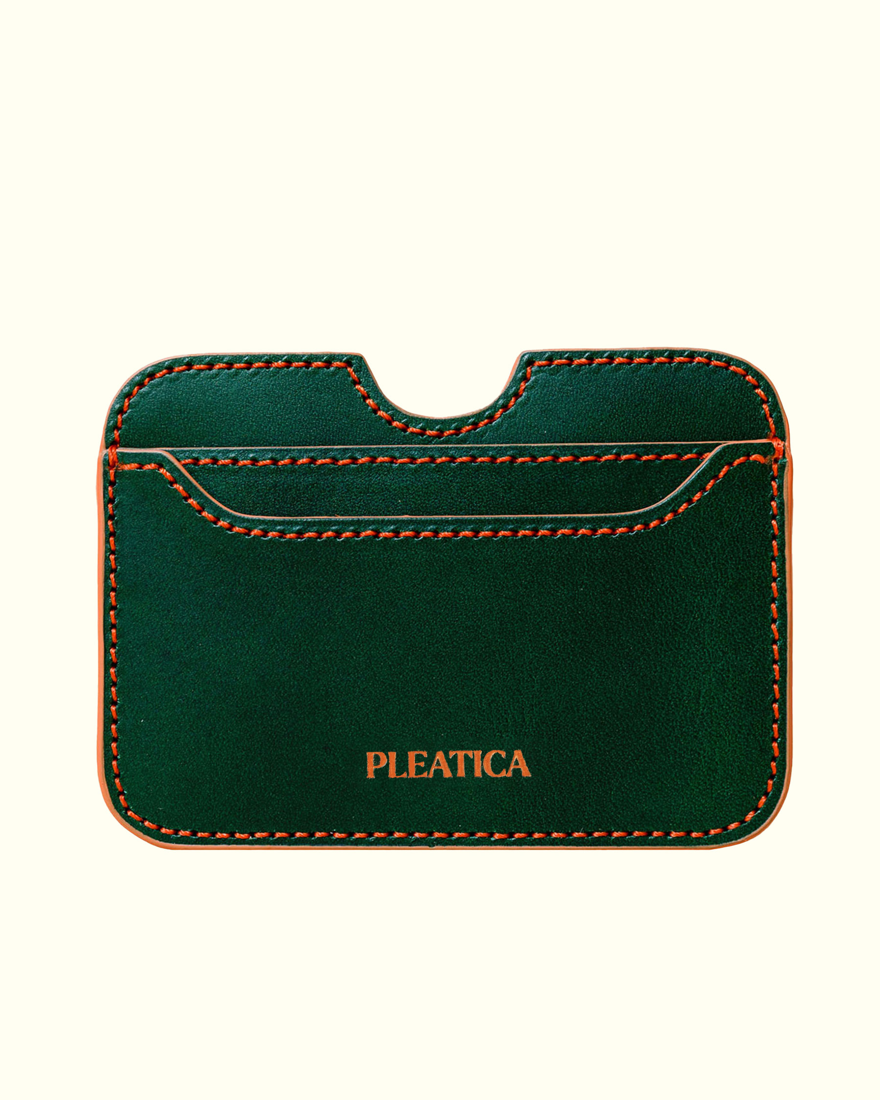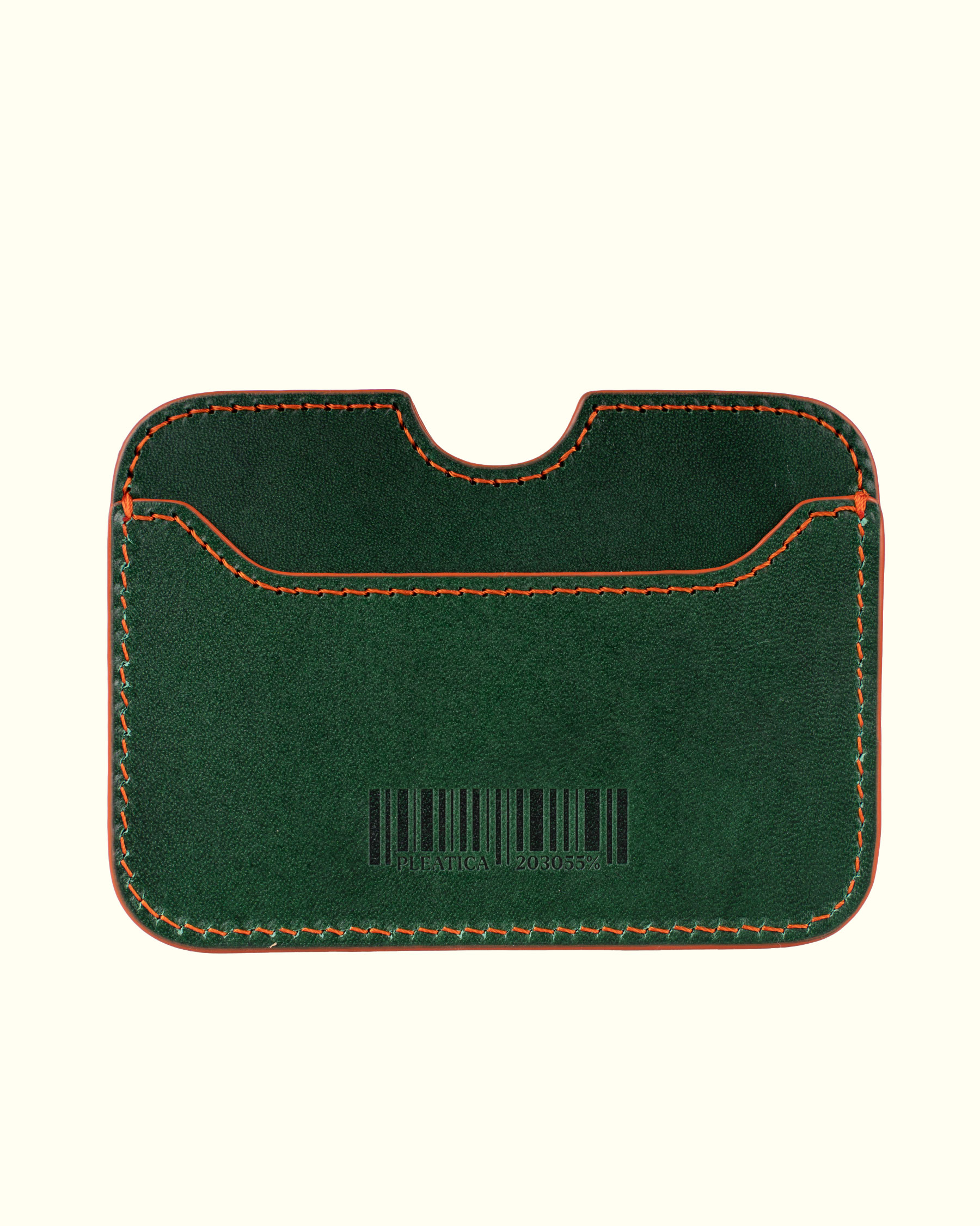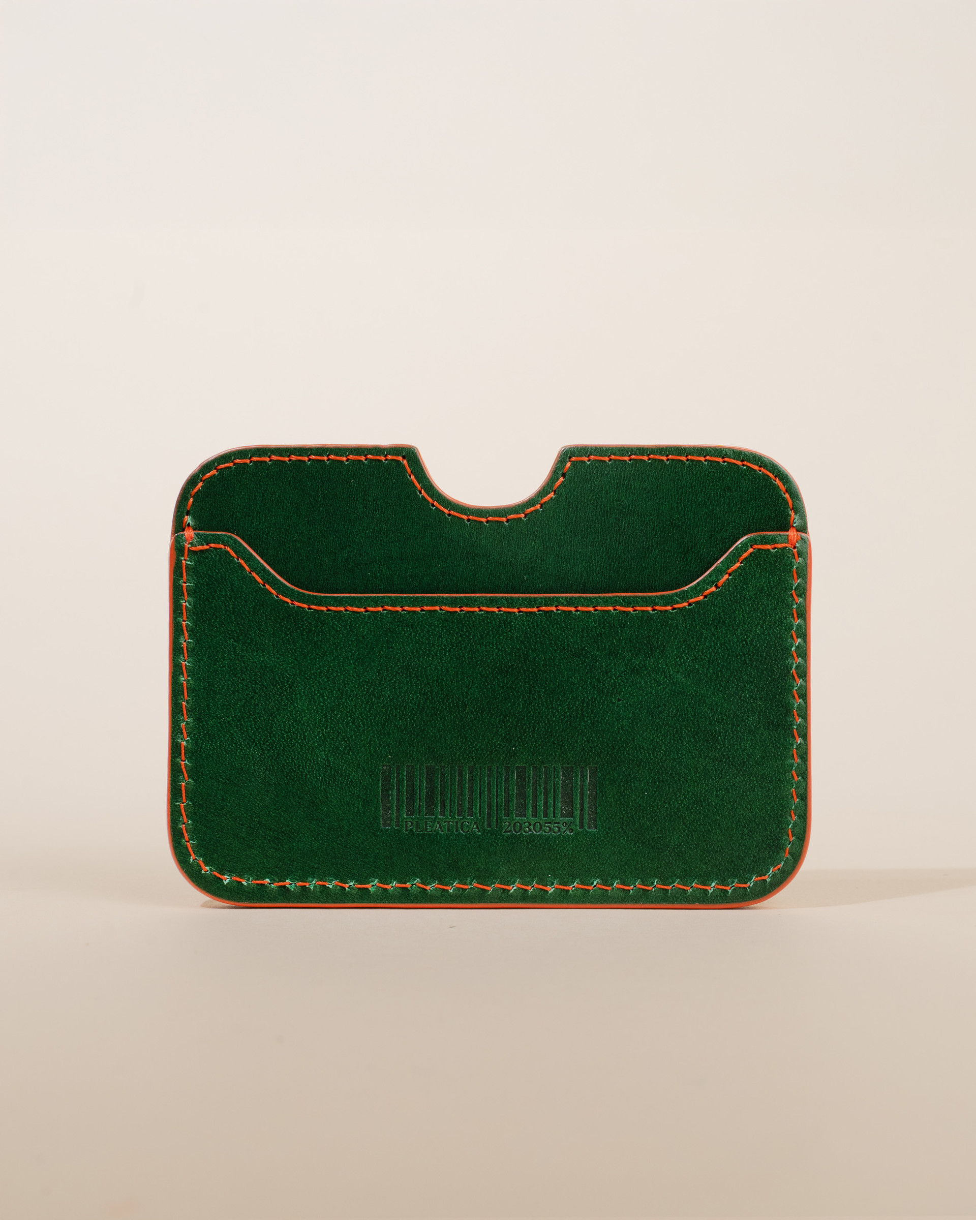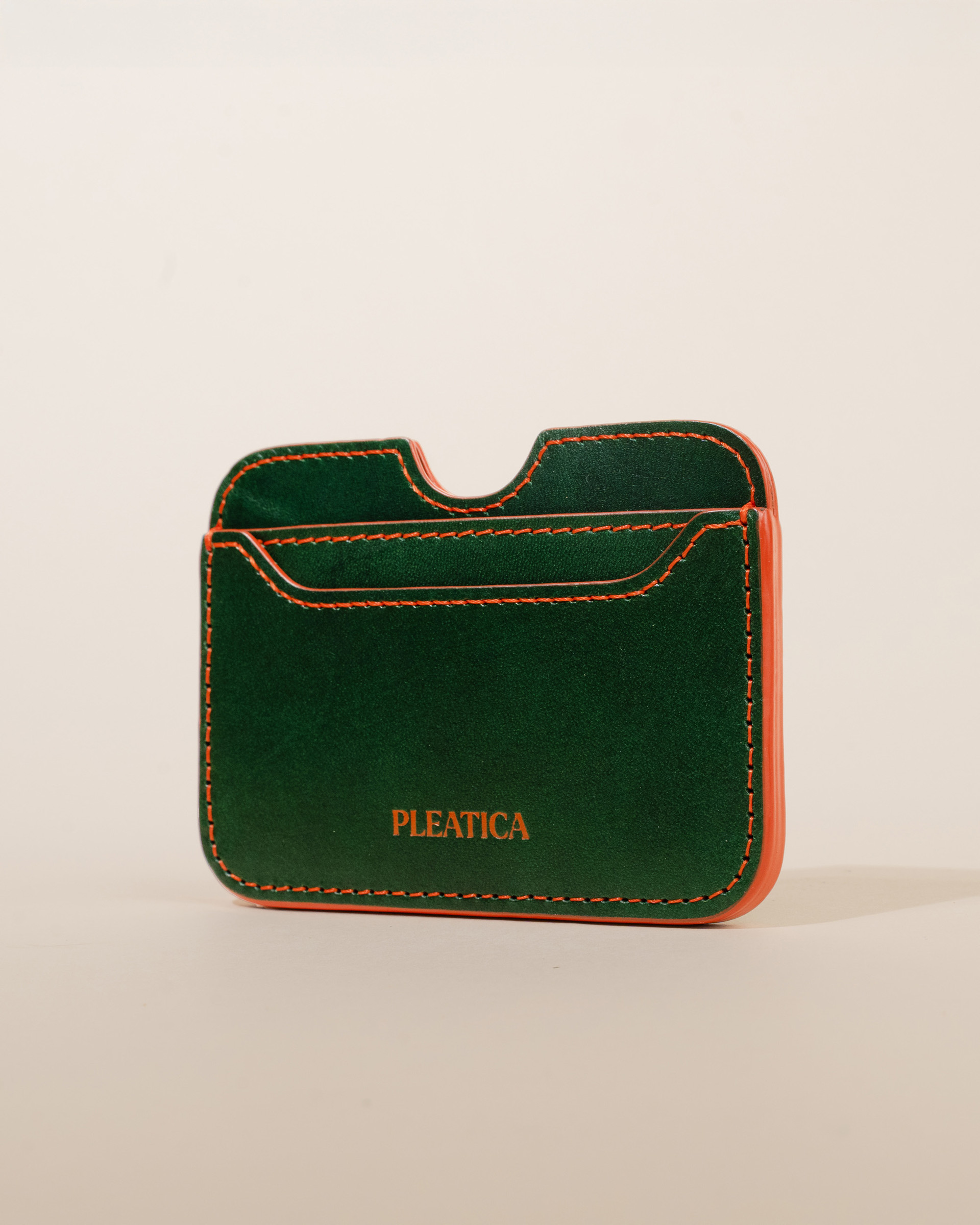 딥 그린 가죽에 오렌지 스티치가 더해져서, 마치 숲 속에서 나무 사이로 비치는 반짝이는 햇살을 떠올리게 해요.