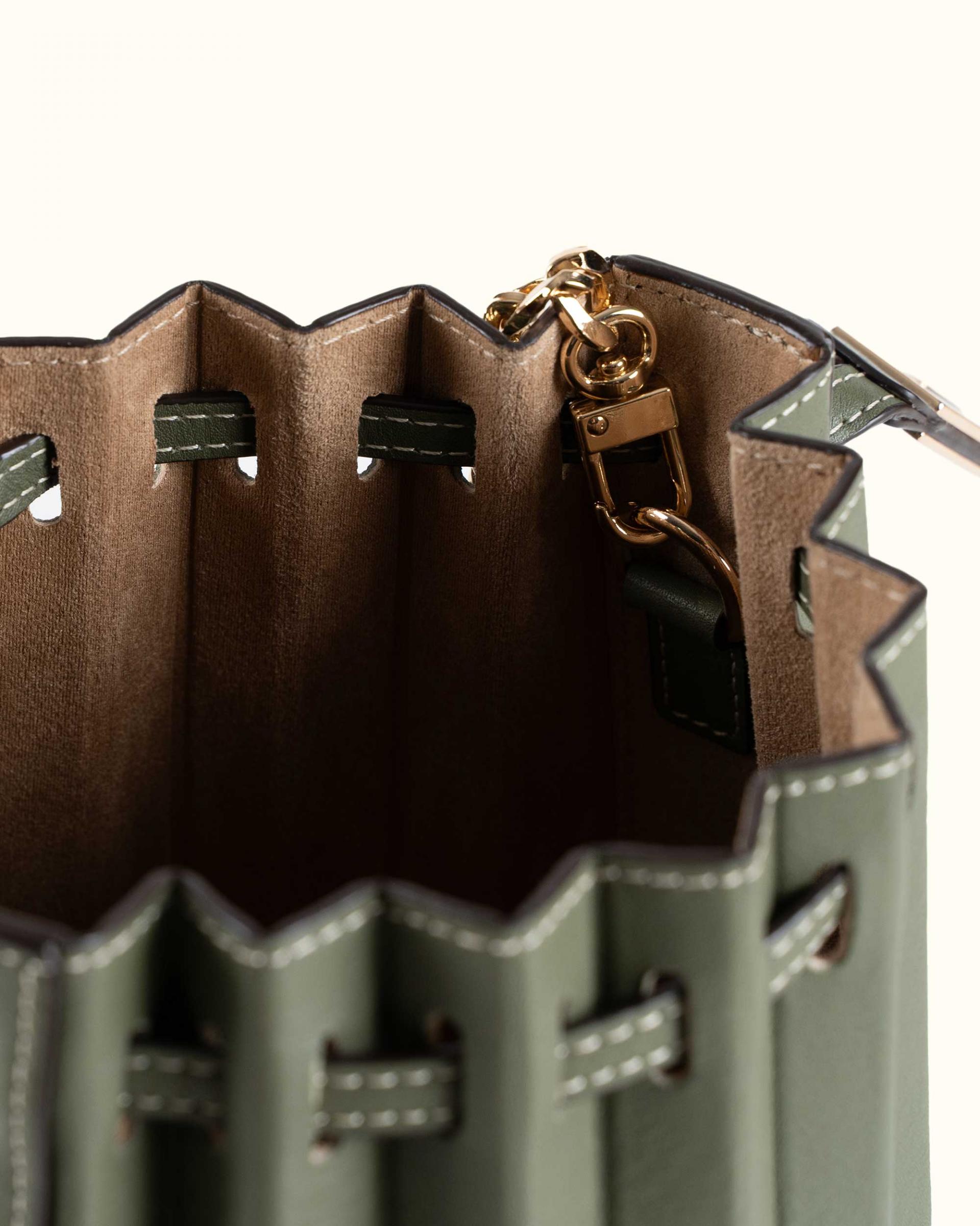 각 잡힌 소가죽 플리츠 디자인이 우아하면서도 견고한 느낌을 주고,
