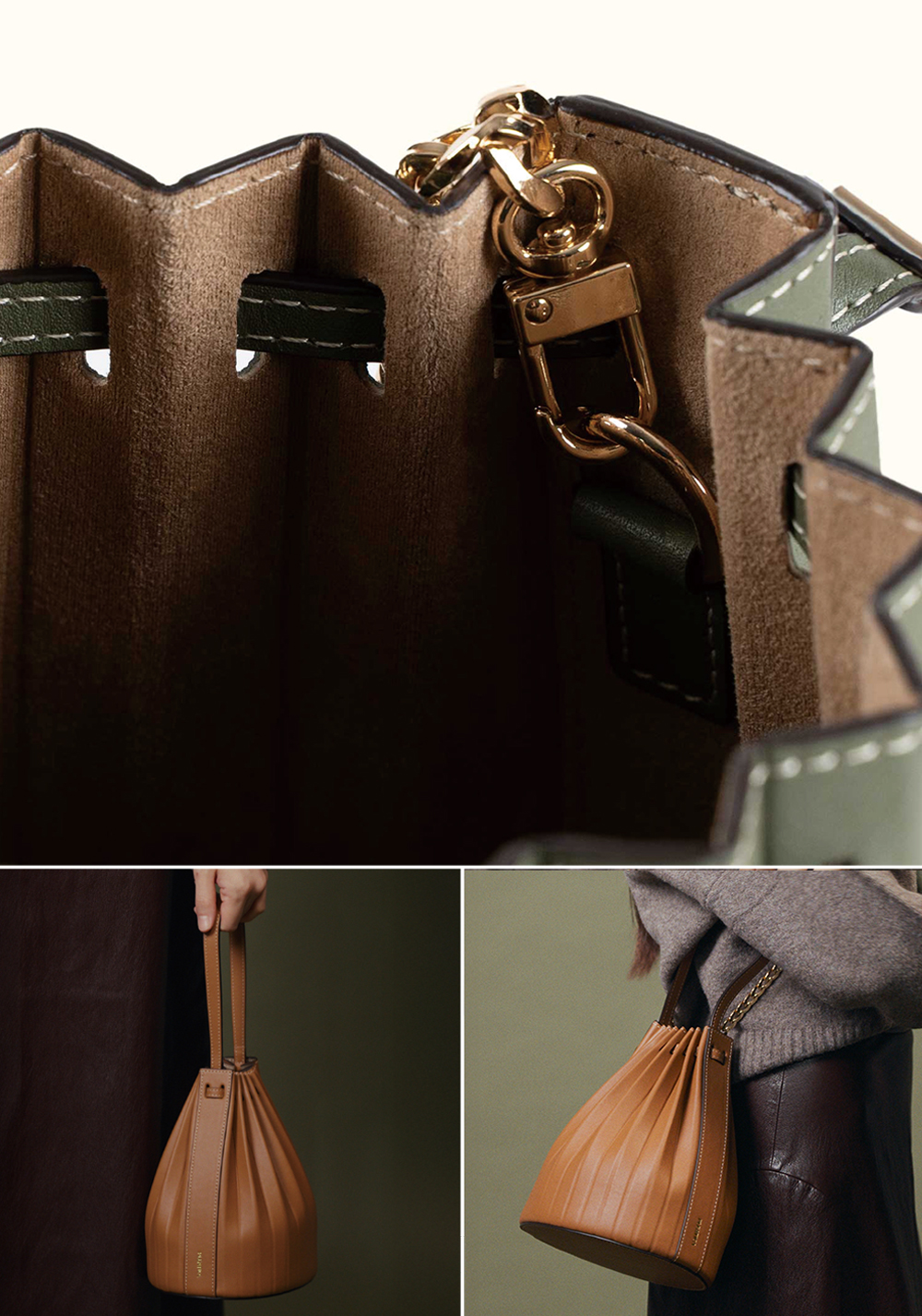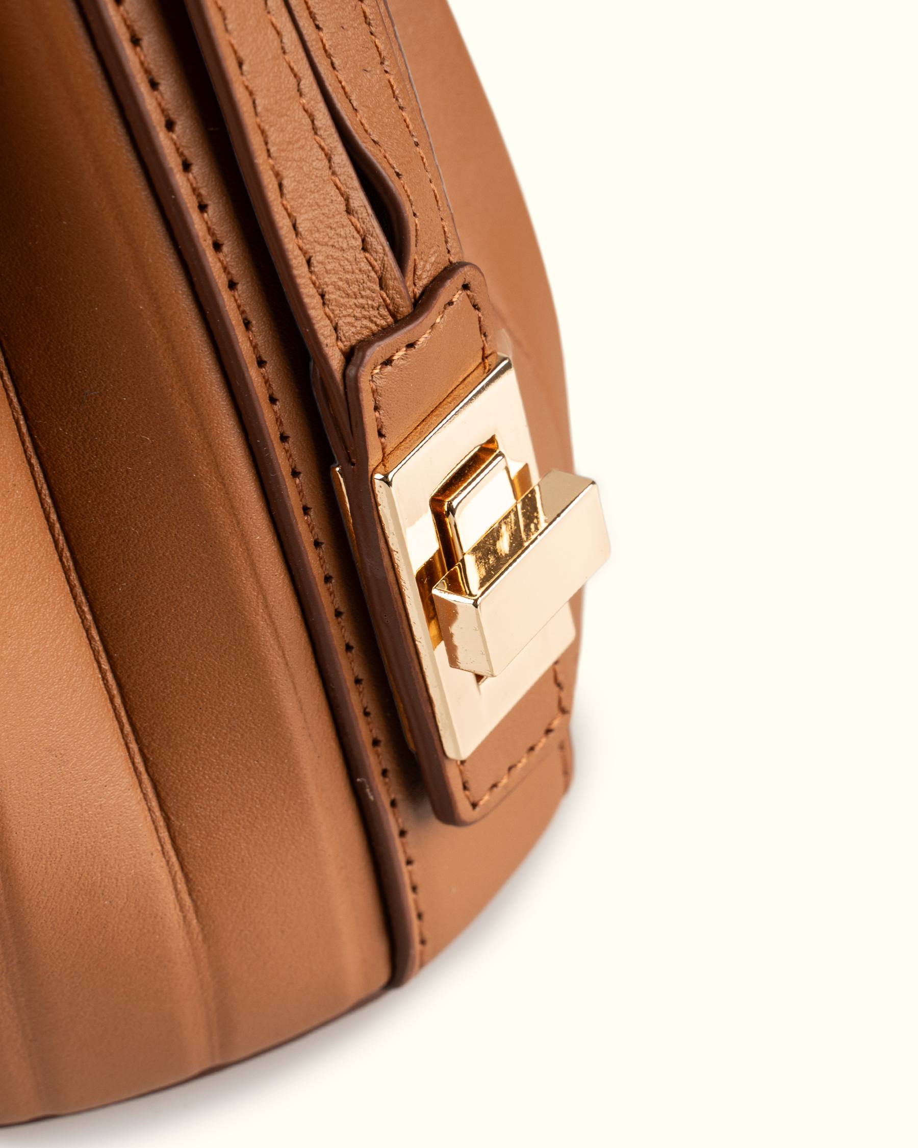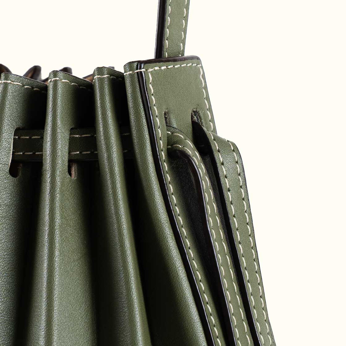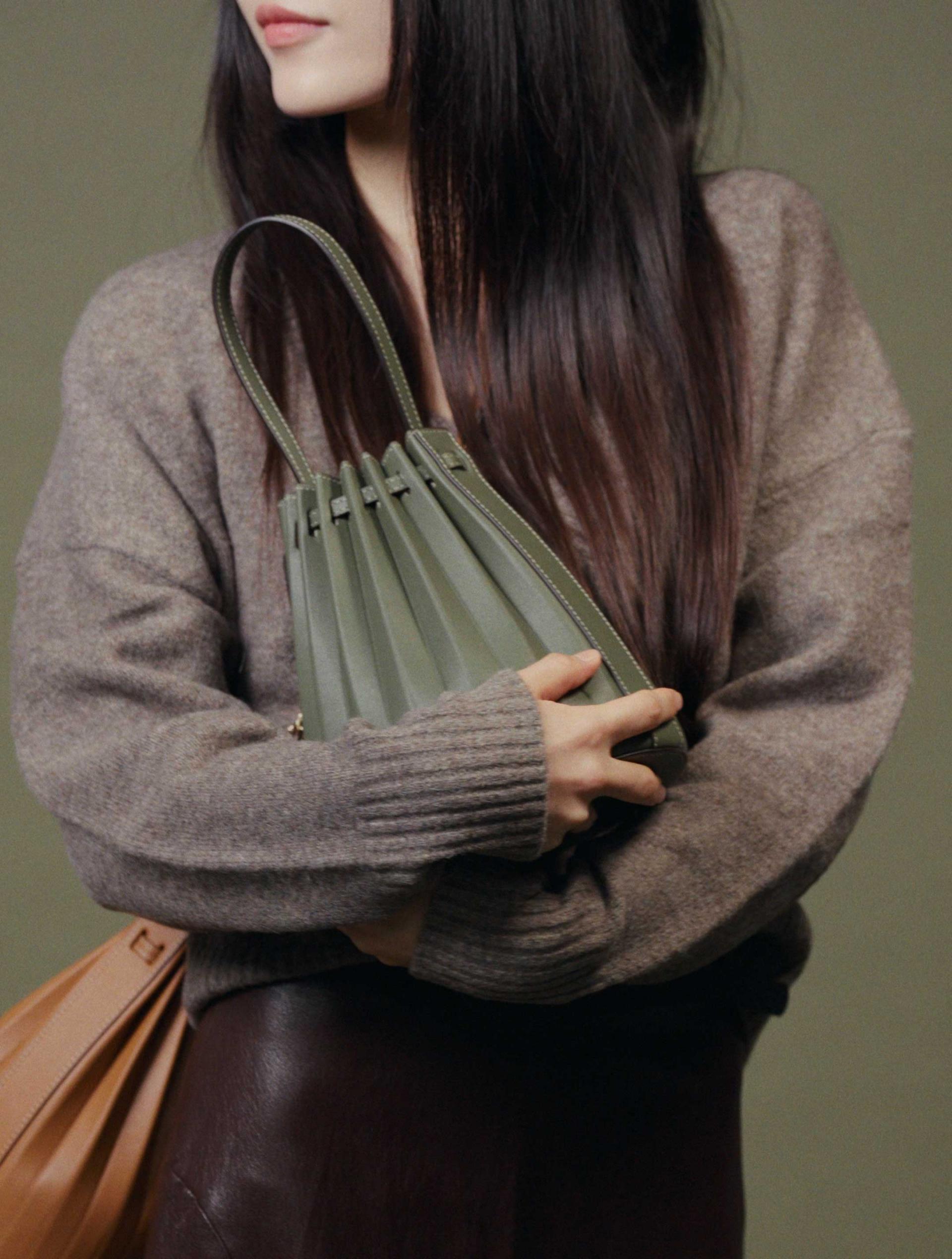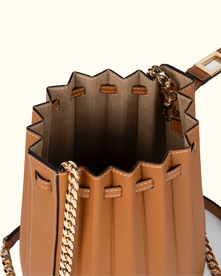 부드러운 탑그레인 나파 소가죽과 정교한 플리츠 디테일의 만남.